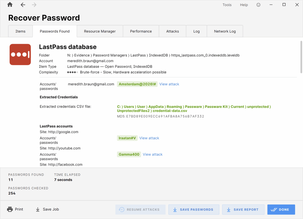 Passware Kit recovers master passwords for the vaults and subsequently extracts user credentials and passwords from them.